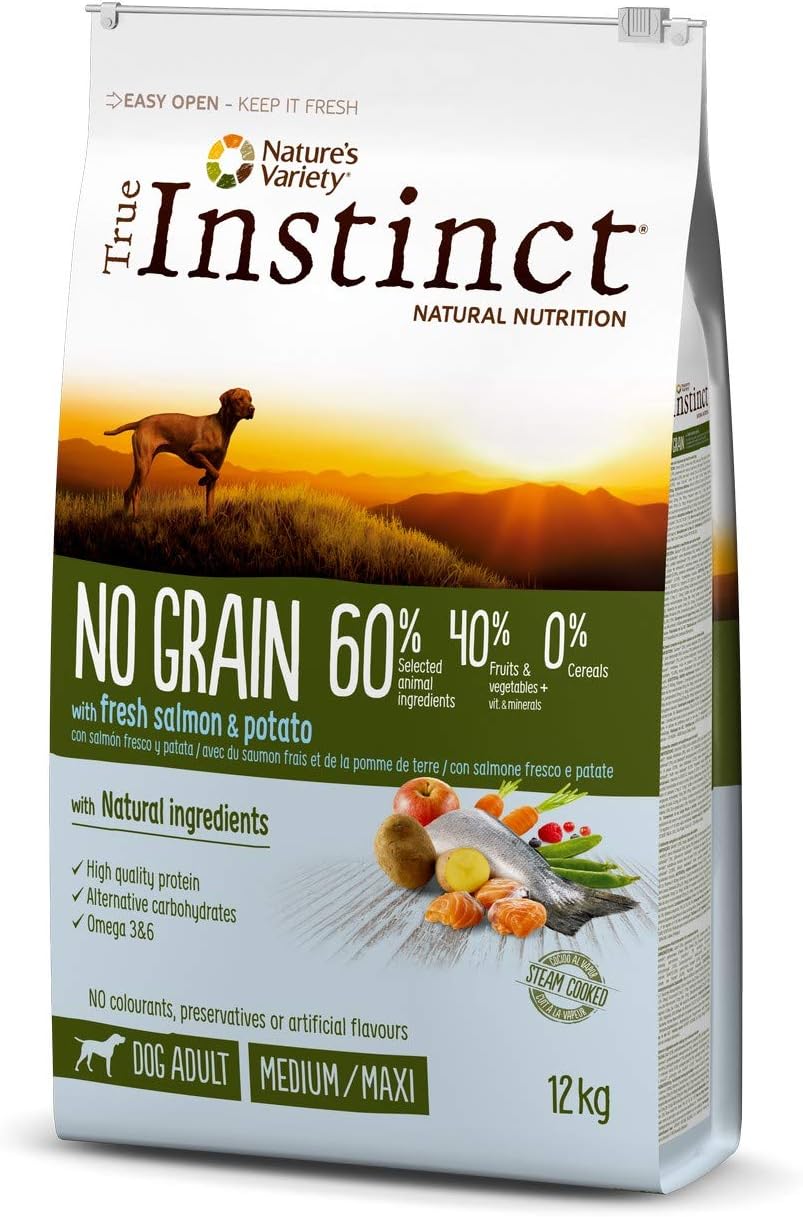 True Instinct No Grain est élaboré à partir d'un mélange idéale, complet et équilibré d'ingrédients naturels préparés à la vapeur. La formule fournit une alimentation sans céréales ; l'ingrédient principal est le saumon frais, associé à une sélection rigoureuse de fruits et légumes comme des petits pois, des pois chiches, et de la pomme de terre, sources alternatives d’hydrates de carbone assurant une santé idéale.