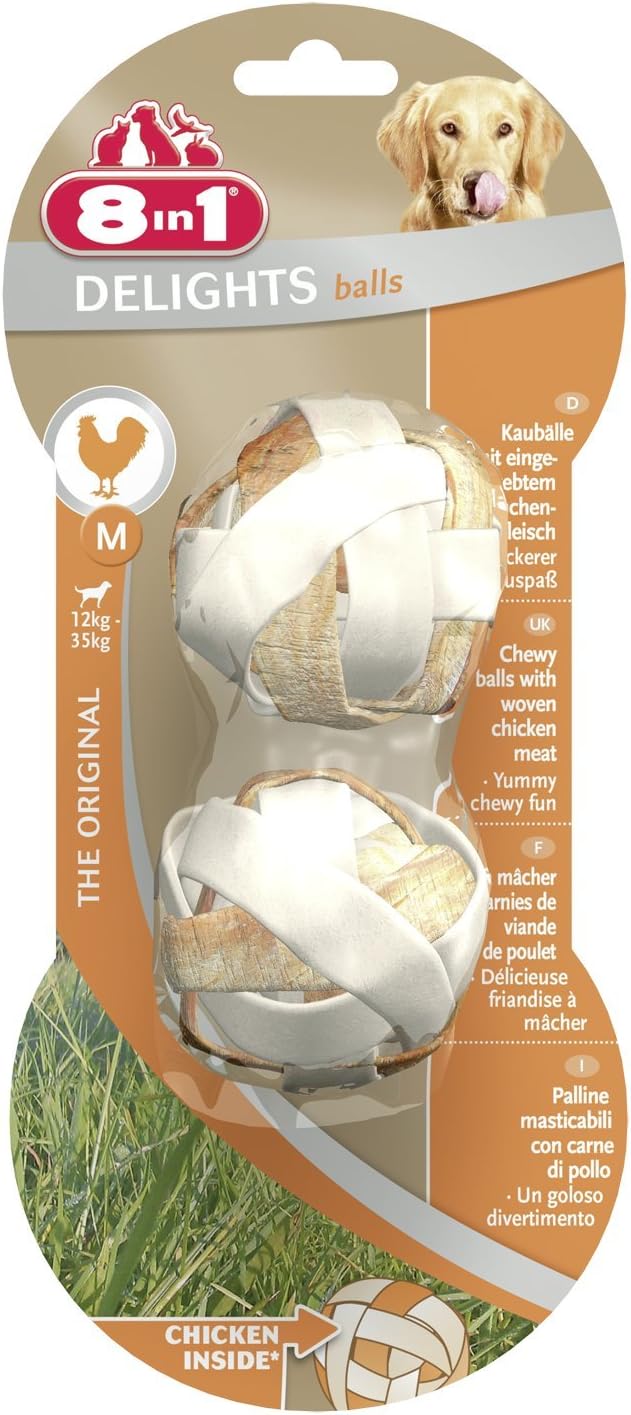 Balles à mâcher Delights M – Parfaites pour les chiens de tailles moyennes à grandes. Recommandées pour les chiens de 12 à 35 kg.